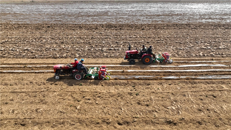 朔城區南榆林鄉青鐘村玉米核心區播種現場,應用了膜側播種技術的播種機在田間播種作業。高文武 攝