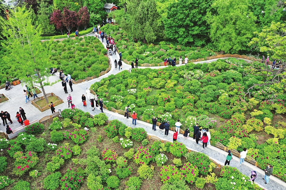 近日,太原迎澤公園牡丹園內,200多個品種、3000余株牡丹競相盛放,吸引了不少游客前來觀賞,呈現出人與自然和諧相融的綠色生態畫卷。圖為5月6日,從空中鳥瞰太原迎澤公園牡丹園。(記者李兆民攝)