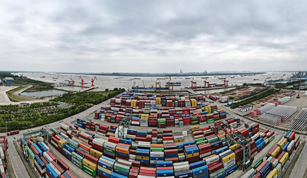 進入5月,揚州長江沿岸港口集裝箱吞吐量增加。港口門機橋吊運轉(zhuǎn)不停,集裝箱卡車往來穿梭,一艘艘集裝箱船在碼頭泊位有序裝卸貨物,一片繁忙景象。 孟德龍 攝