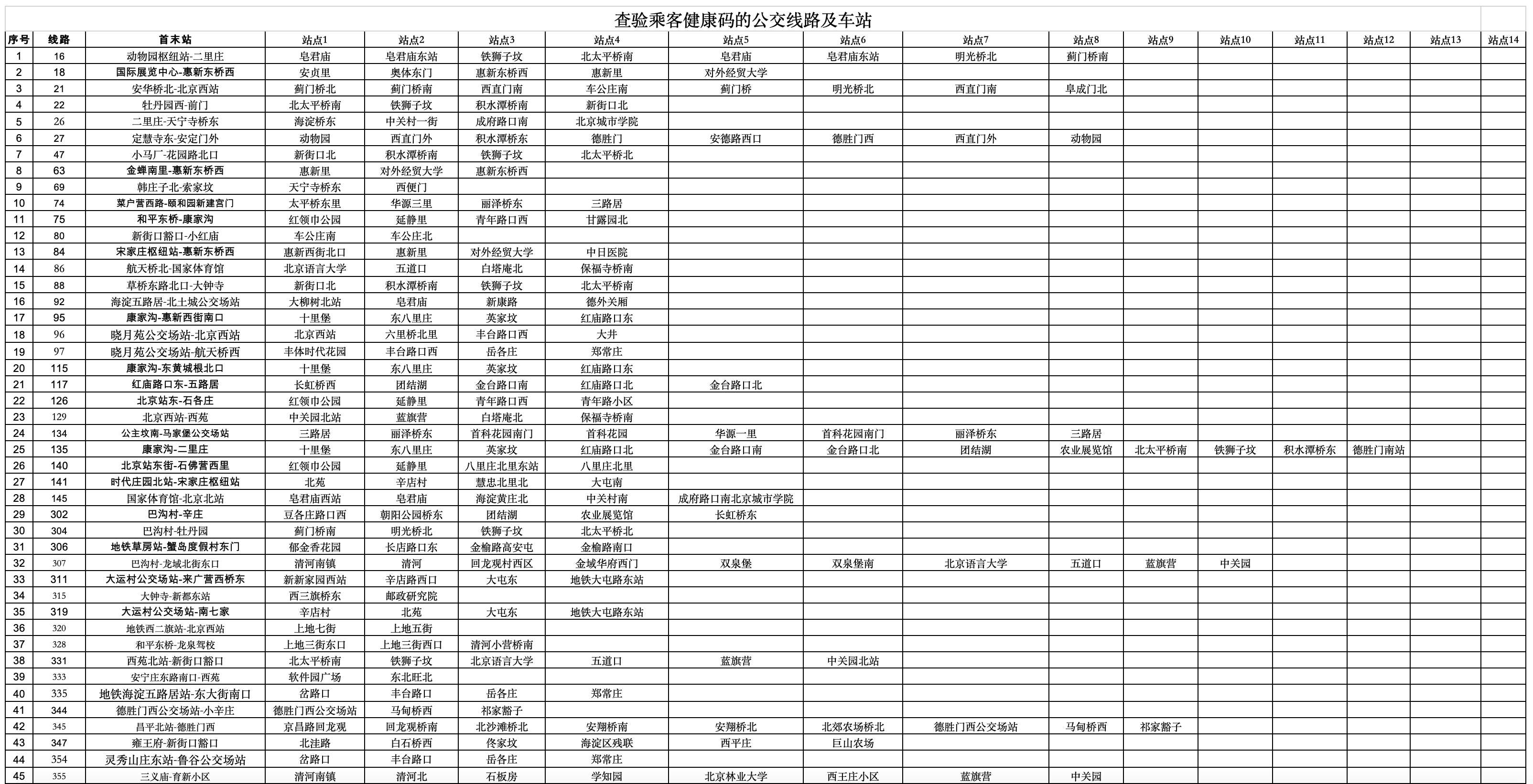 人民網北京5月16日電 (池夢蕊)根據北京市疫情防控需要,為做好精細精準防控,自2022年5月17日首班車起,北京市疫情防控封控區、管控區周邊的190條地面公交線路重點車站和54座地鐵車站(具體見附表),查驗乘客健康碼上車。后續將結合北京市疫情防控措施進行動態更新。