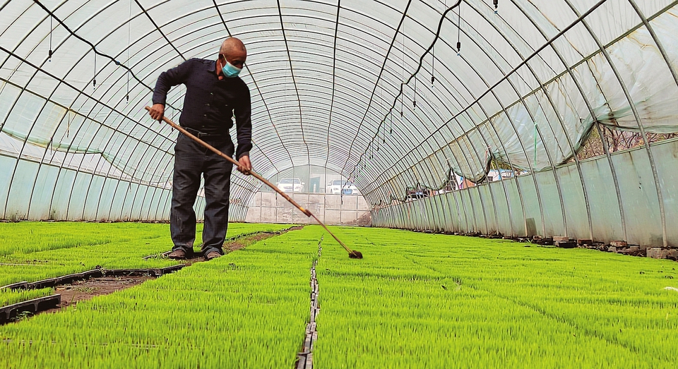 5月14日,太原市晉源區(qū)花塔村育秧基地村民正在護(hù)理秧苗。眼下正是農(nóng)忙時(shí)節(jié),晉源區(qū)在去年花塔村自動(dòng)育秧基地的基礎(chǔ)上,新擴(kuò)建王郭村、北大寺村、稻花城3個(gè)育秧基地,優(yōu)選新稻種,擦亮區(qū)域性特色農(nóng)產(chǎn)品品牌。當(dāng)?shù)赜行蚪M織村民推進(jìn)育秧、整地等,滿足全區(qū)3300畝晉祠水稻的插秧需求。(記者李兆民攝)