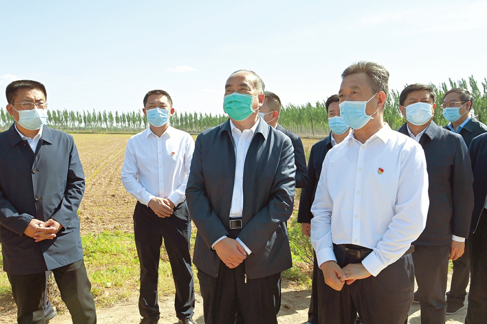 五月十七日下午,省委書記林武來到汾陽市賈家莊鎮古浮圖村,走進田間察看玉米、大豆幼苗長勢和土壤墑情。記者史曉波攝