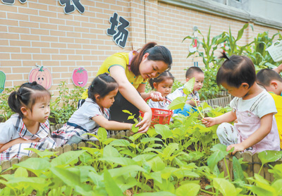 江西省贛州市全南縣幼兒園通過開展“合理營養與健康飲食”主題教育活動,引導孩子們均衡營養、珍惜糧食。圖為老師在幼兒園快樂農場教小朋友們采摘蔬菜。