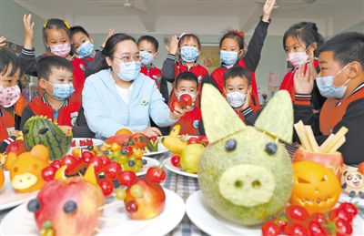 5月20日是“中國學生營養日”。近日,山東省東營市東營區一家幼兒園里,師生把五顏六色的水果、蔬菜制作成各種造型,并在制作過程中了解各種水果、蔬菜的營養價值,引導孩子們不挑食、不偏食,拒絕浪費,樹立健康飲食觀念。