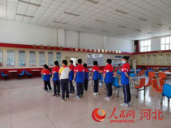 石家莊市少年兒童保護教育中心的孩子們在排隊吃午飯。 人民網 祝龍超攝
