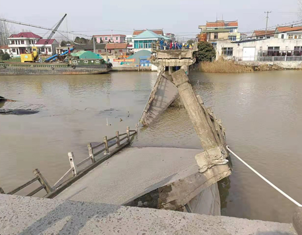 橫跨九圩港河的英雄大橋是劉橋鎮群眾出行的重要通道。2021年1月5日,大橋遭貨船撞擊后垮塌,給九圩港河兩岸村民出行帶來不便。此后,當地群眾過河不得不繞行,近的繞行四五公里,遠的十來公里。“孩子們每天上學放學都要繞行,遇到惡劣天氣尤為不便。”蔣一村村民陸漢林說,大家都盼著重建大橋。