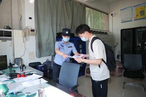 “請他到學校警務室,我們馬上采集信息。”對講機里,傳來了讓這位同學安心的聲音。在確認其身份信息后,正在校警務室待命的鹽瀆派出所高考考生服務點民警蔡亞華迅速為其出具了臨時身份證明。從報告情況到將臨時身份證明送達考生手中,僅用時5分鐘。