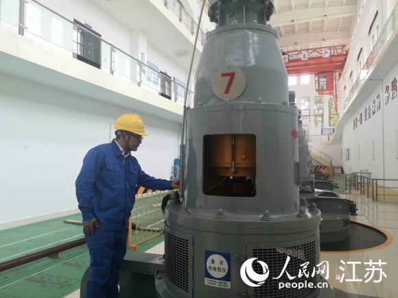 工作人員在江都水利樞紐第四抽水站檢查水泵運行。 人民網 張玉峰攝