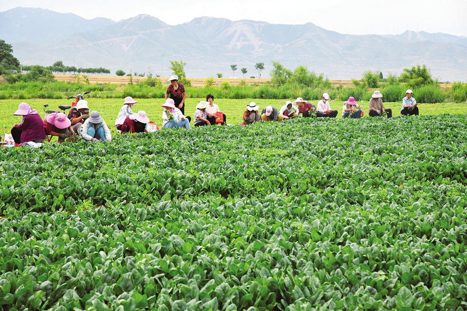 6月1日,聞喜縣后宮鄉新陽莊村村民正在收割大田菠菜,準備發往市場。