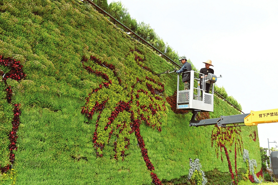 6月9日,太原植物園內,園藝師在一面布滿綠植的墻面上修剪出一幅美麗的畫卷。太原植物園開放以來,以優美的原生態綠色景觀吸引了大批游客,成為省城綠色生態“打卡地”。(記者阮洋攝)