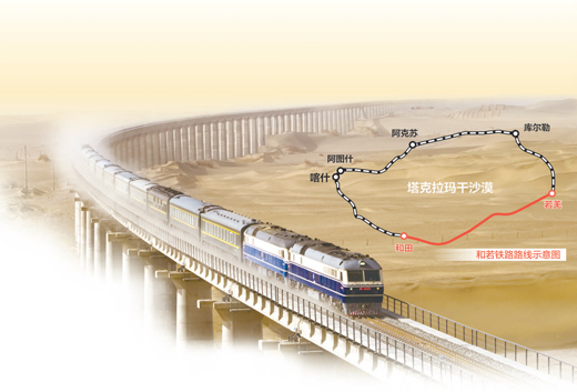 作為國家重點鐵路建設項目,和若鐵路西起新疆和田地區和田市,東至巴音郭楞蒙古自治州若羌縣,全長825公里,設計時速120公里。和若鐵路開通后,與南疆鐵路、格庫鐵路相連,全長2712公里,形成世界首個沙漠鐵路環線。
