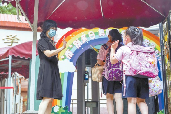 昨天早晨,豐臺區芳古園小學,因疫情闊別校園多日的小學生返校復課,老師在校門口歡迎孩子們歸來。本報記者 鄧偉攝