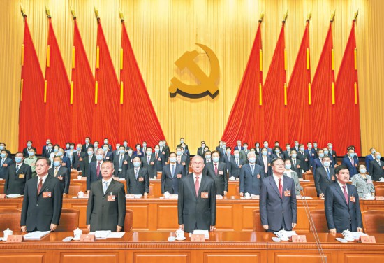 北京會議中心會議廳雄偉莊嚴、氣氛熱烈。主席臺上方懸掛著鐮刀和錘頭組成的中國共產黨黨徽,10面鮮艷的紅旗分列兩側。