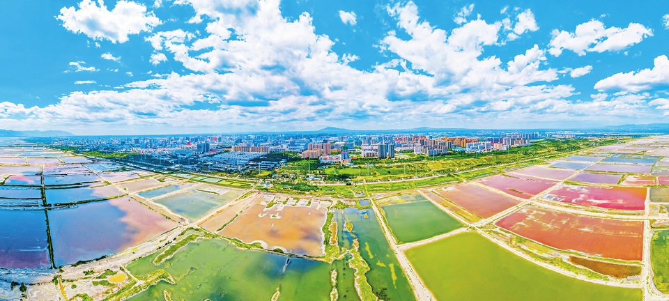 6月28日,運城市中心城區,藍天白云與七彩鹽湖交相輝映,美不勝收。近年來,運城市緊緊圍繞綠色發展理念,加強鹽湖生態資源的保護和修復,將鹽湖打造成生物多樣的生態空間、風光旖旎的旅游目的地、愜意舒心的居民休憩地。(陳方斌攝)