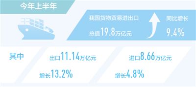 本報北京7月13日電 (記者杜海濤)據海關統計,今年上半年我國貨物貿易進出口總值19.8萬億元,同比增長9.4%。其中,出口11.14萬億元,增長13.2%;進口8.66萬億元,增長4.8%。