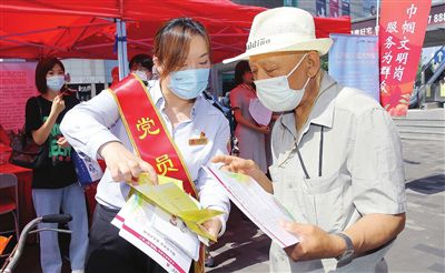 7月13日上午,天津市和平區濱江道樂賓百貨門前,市第十二次黨代會精神宣講展位彩旗招展,群眾絡繹不絕。來自衛健、科技、政法、交通、公共服務、社會組織等方面50多個各級各類的為民服務窗口型“巾幗文明崗”“巾幗建功先進集體”志愿者齊聚,以學習宣傳貫徹市第十二次黨代會精神暨“迎盛會、鑄忠誠、強擔當、創業績”巾幗文明崗為群眾服務活動為主題,開展多項便民服務。