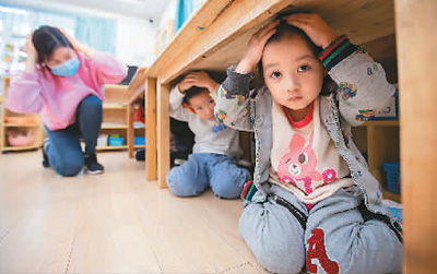圖四:江蘇省南京市雨花臺區龍福幼兒園小朋友們學習防災減災自救技能。蘇陽攝(人民視覺)