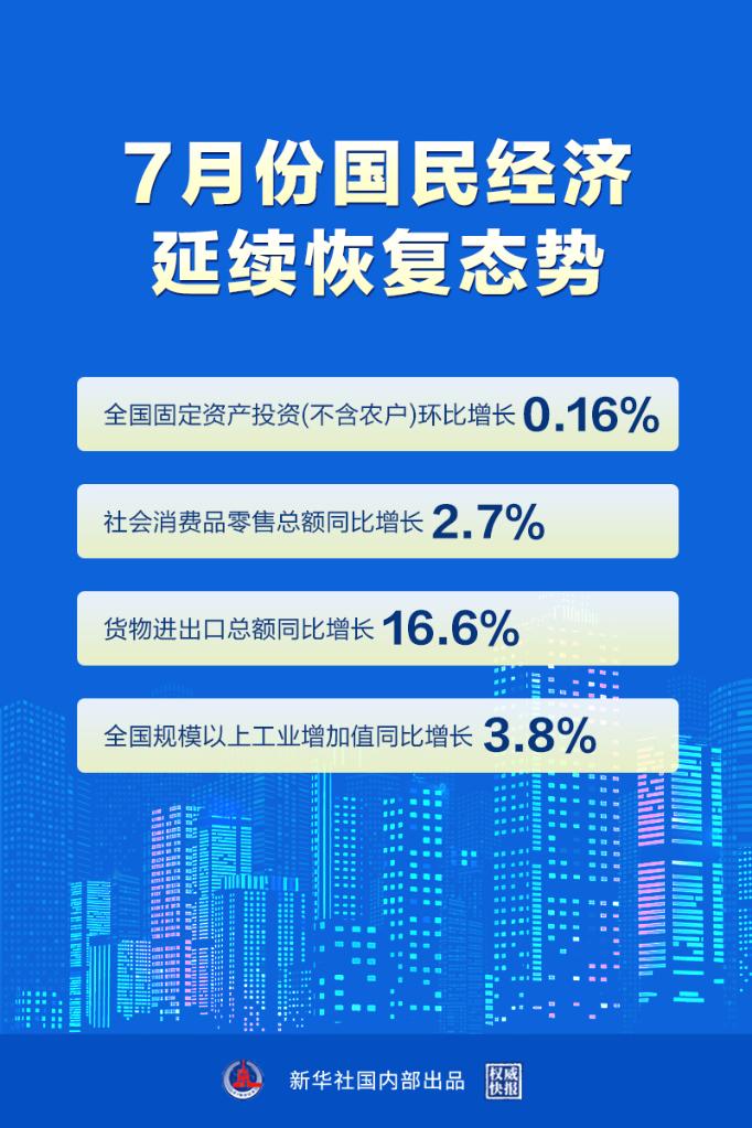 國家統計局15日發布數據顯示,7月份,生產供給繼續恢復,就業物價總體平穩,對外貿易增勢良好,民生保障有力有效,國民經濟延續恢復態勢。