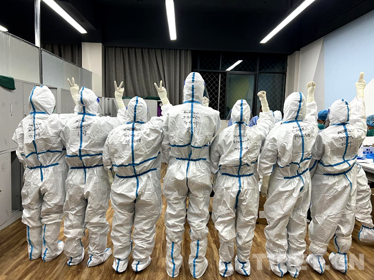 圖為拉薩市第二座方艙醫院醫護人員們正在穿防護服準備開始一天的工作 攝影:次仁卓瑪
