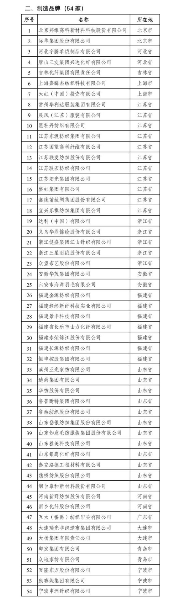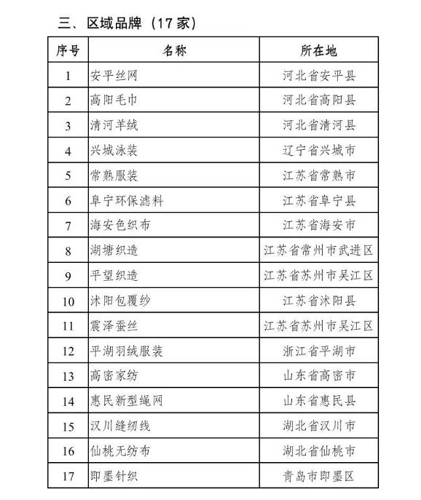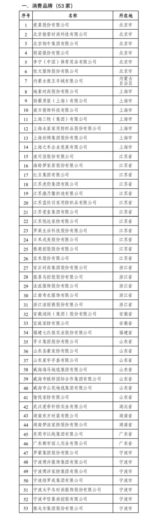 此次入選的江蘇消費品牌包括波司登、海聆夢家居、紅豆、虎豹、康乃馨、藍絲羽、堂皇、悅達家紡、羅萊、日禾戎美、雅鹿、宜禾等。制造品牌包括常州華利達、晨風、黑牡丹紡織、東渡紡織、國望高科纖維、聯發紡織、聯宏紡織、陽光、盛虹、鑫緣、宜興樂祺等。區域品牌包括常熟服裝、阜寧環保濾料、海安色織布、湖塘織造、平望織造、沭陽包覆紗、震澤蠶絲等。