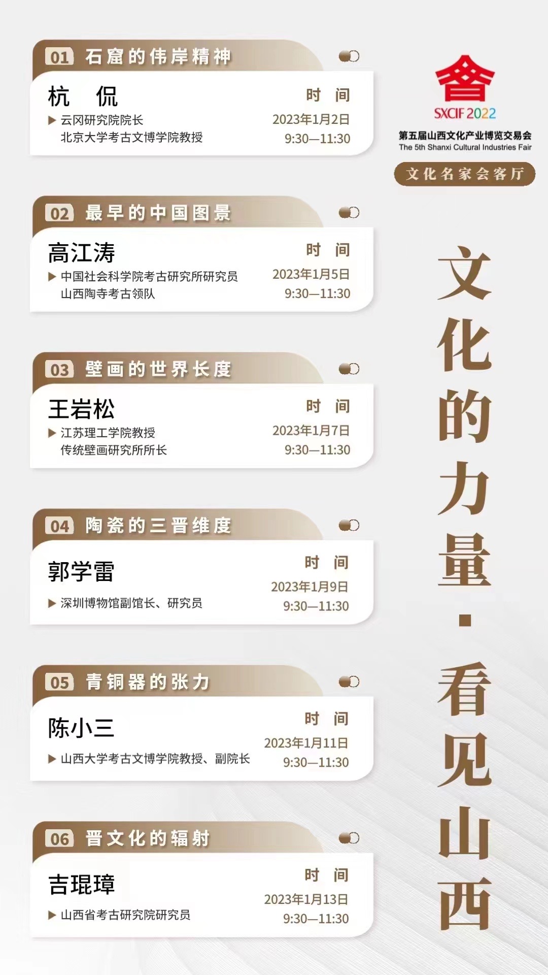 人民網太原12月30日電(記者麻潞)連日來,正在進行的第五屆山西文化產業博覽交易會(云上文博會),帶給了人們精彩的視聽享受。從2023年1月2日起,云上文博會系列活動之“文化名家會客廳”將正式上線,屆時省內外文博名家輪番登場,帶你“看見山西”。