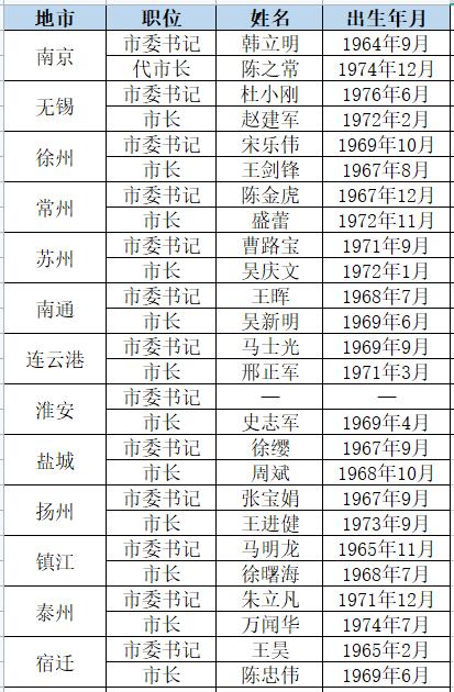 人民網統計發現,江蘇設區市黨政主官中“70后”已達10位,占比近半。其中,蘇州、無錫、泰州三市的黨政主官均為“70后”。江蘇各市黨政主官里,目前最年輕的是出生于1976年的無錫市委書記杜小剛。