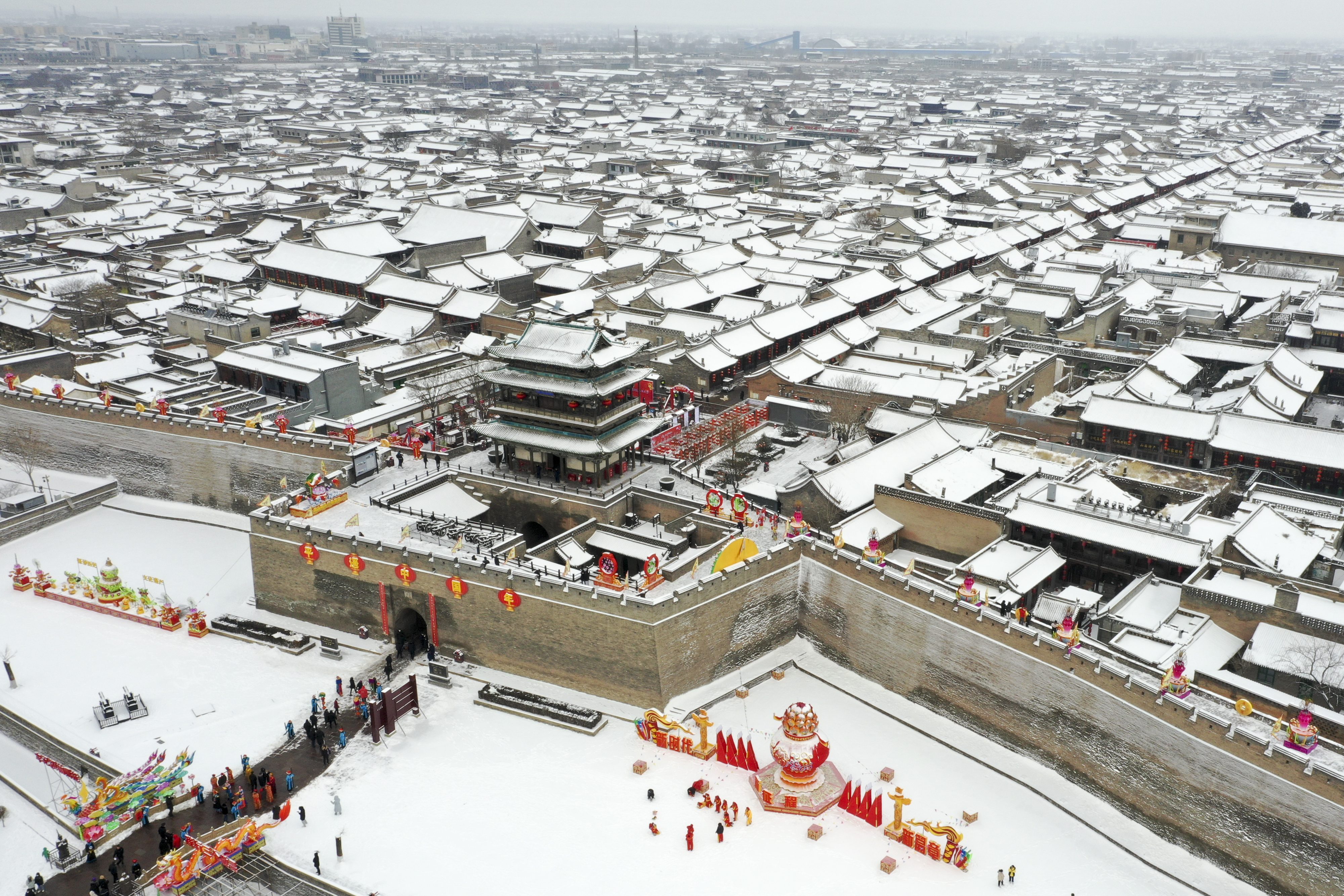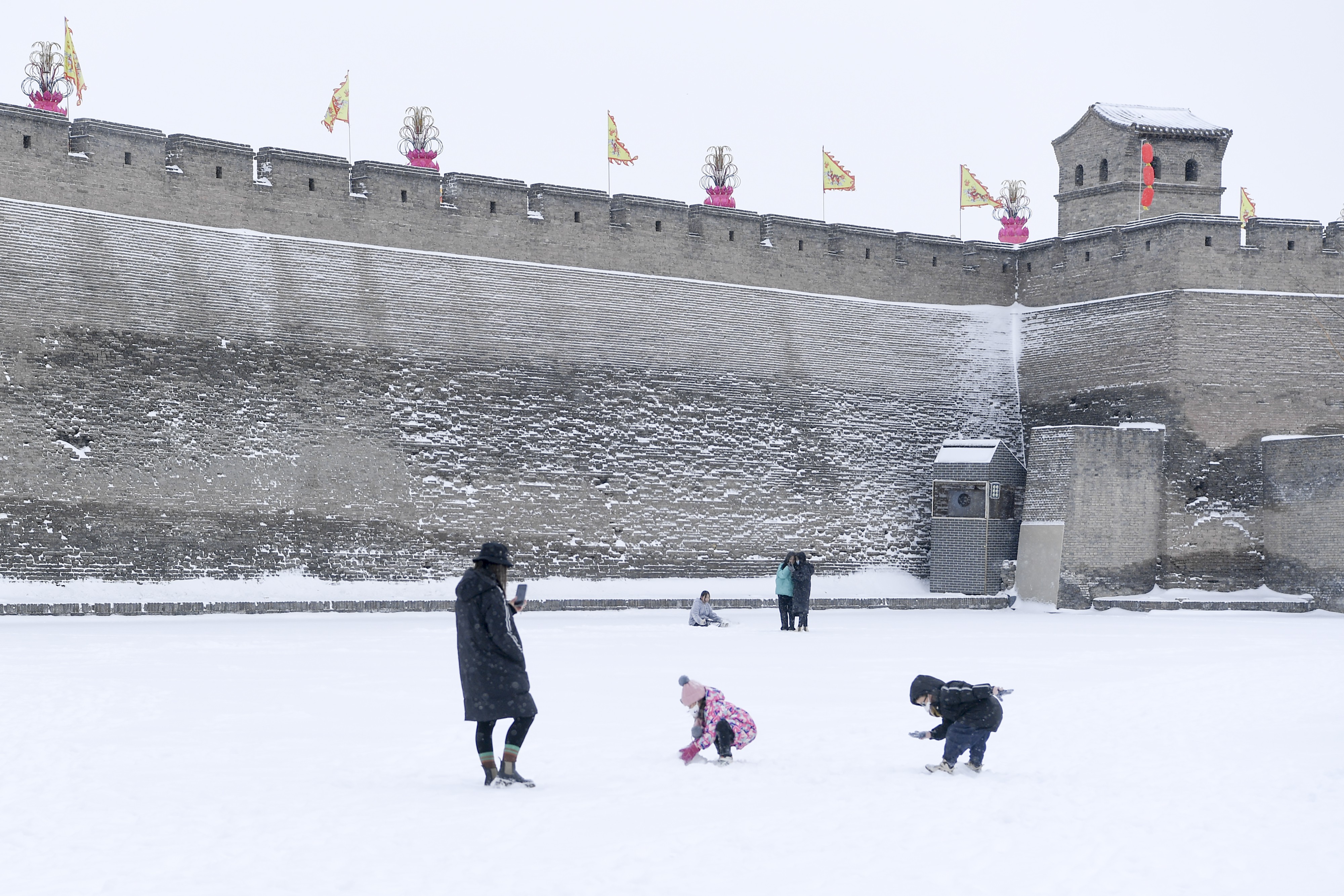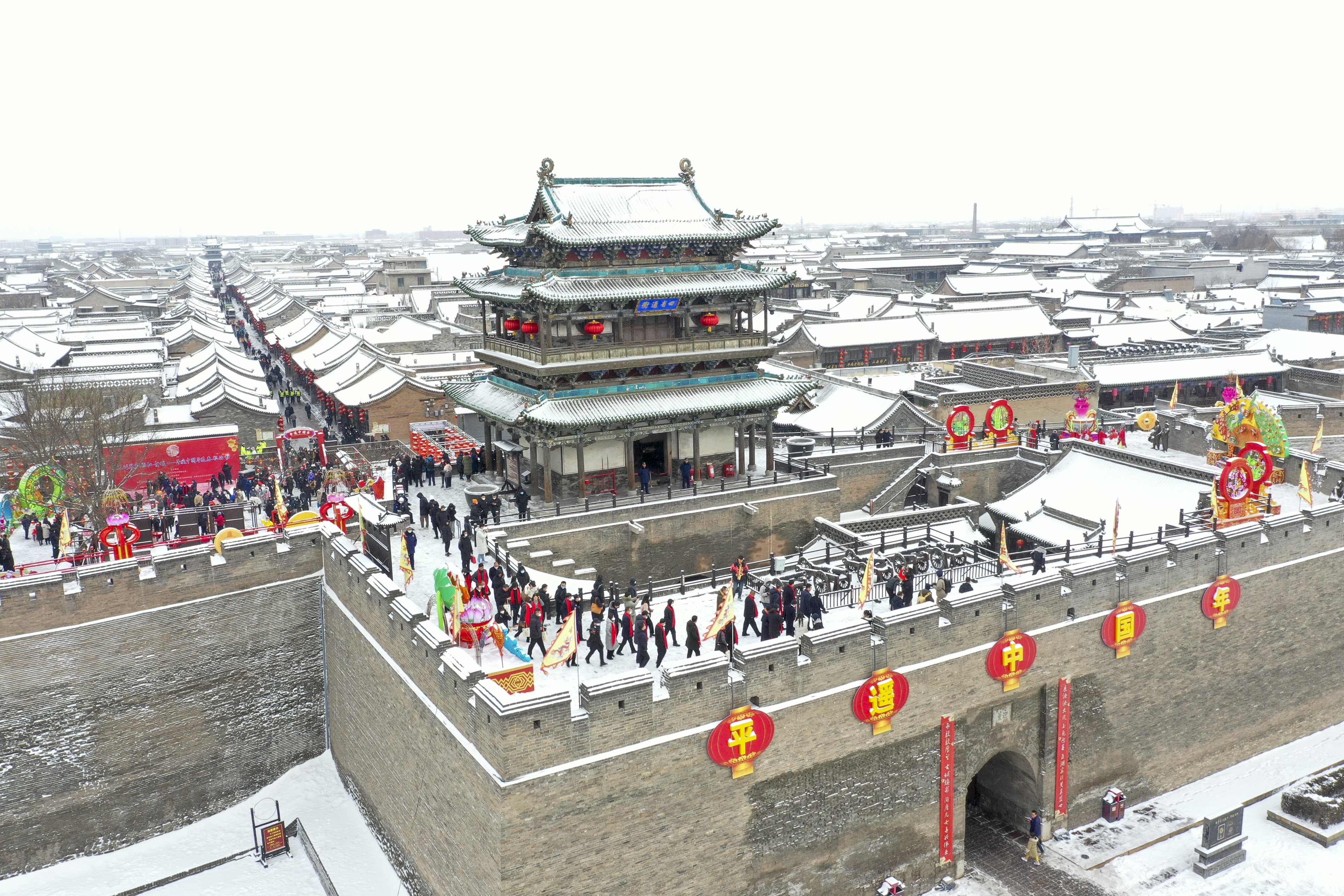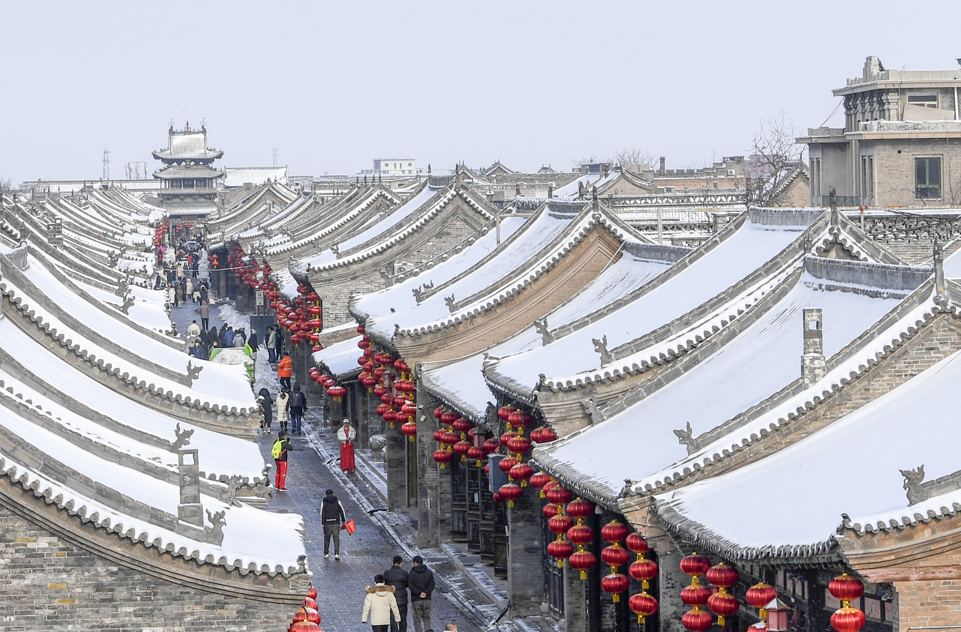 1月14日,山西省晉中市平遙縣迎來入冬以來首場降雪,雪中的平遙古城銀裝素裹,美景如畫。當日,恰逢2023年“我們的節日·春節——平遙中國年”活動在這里啟幕,來自各地的游客在雪中游覽古城,別有一番韻味。(梁生仁攝)