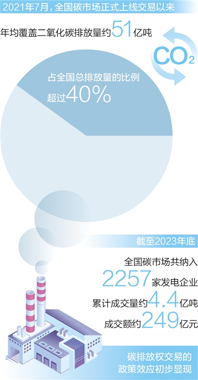 2021年7月全國碳市場正式上線交易以來,運行整體平穩,年均覆蓋二氧化碳排放量約51億噸,占全國總排放量的比例超過40%。截至2023年底,全國碳市場共納入2257家發電企業,累計成交量約4.4億噸,成交額約249億元,碳排放權交易的政策效應初步顯現。