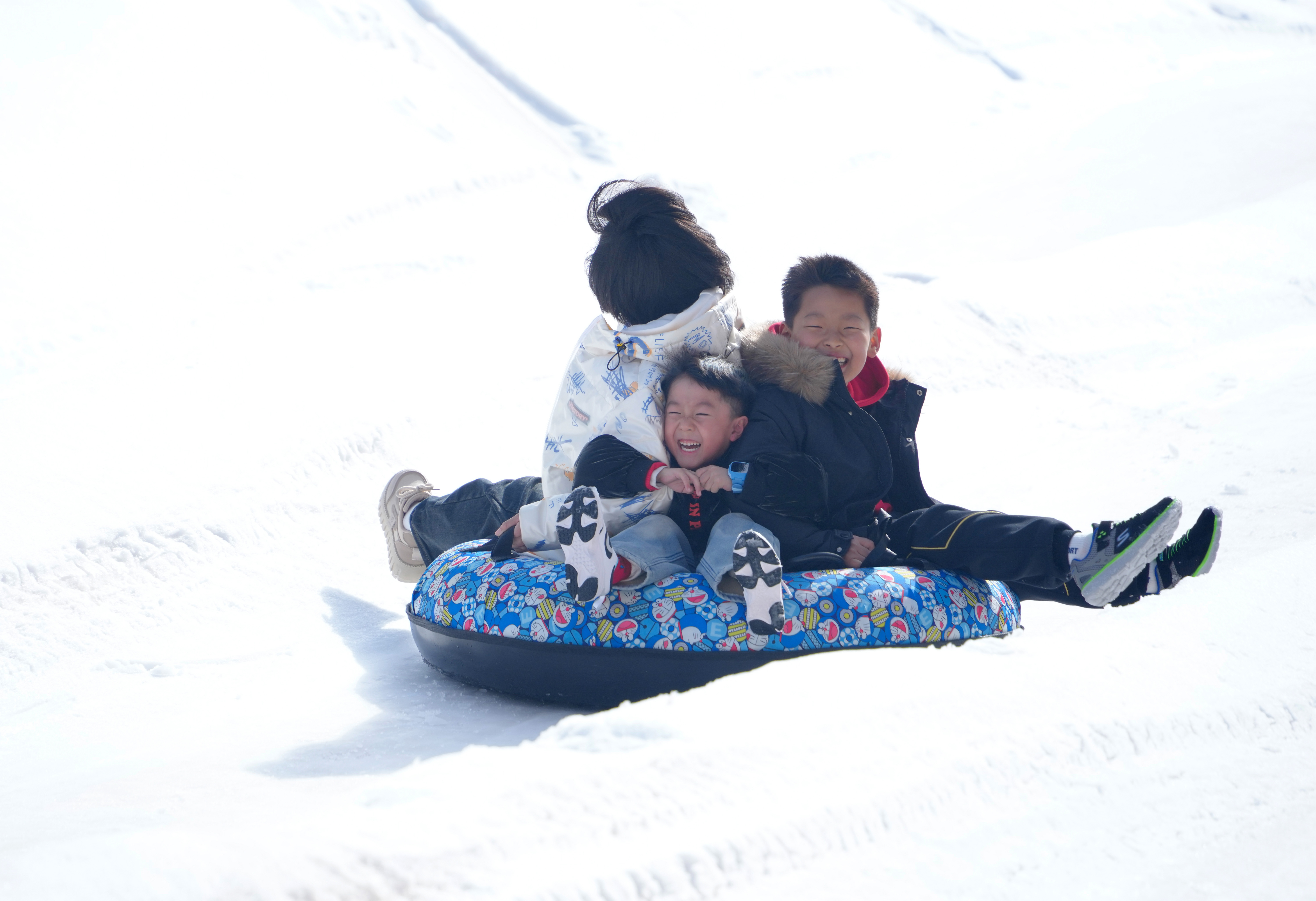 從滑雪坡上乘滑雪圈疾馳而下,大朋友、小朋友“全副武裝”盡情撒歡,游客們在冰雪運動中增強體質,樂享春節假期生活。(閆鑫 攝)
