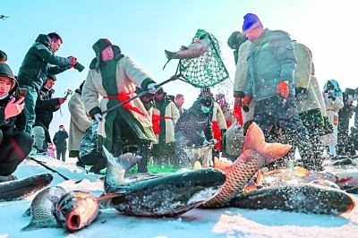 最激動人心的,當屬收網出魚的時刻。十幾名漁民排著隊將大網緩緩拉出,數千公斤的鯉魚、鰱魚、草魚相繼出水,活蹦亂跳的鮮魚在網中打著滾、撒著歡躍上冰面,異常壯觀。今年的冰下巨網捕魚迎來大豐收,當天,博斯騰湖新年冬季巨網捕魚第一網捕撈出6噸有機魚。