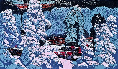 充滿粗獷刀味和雄渾之氣的色塊構(gòu)成,是晁楣版畫的魅力所在。他的藝術(shù)風(fēng)格從何而來?答案源于其在創(chuàng)作實踐中的自我體悟。在藝術(shù)創(chuàng)作中,晁楣深刻把握了藏與露、簡與繁、整體與局部等多對概念之間的對立統(tǒng)一關(guān)系。與以人為主要表現(xiàn)對象的傳統(tǒng)黑白木刻有所不同,他的套色木刻以北大荒雄渾壯闊的風(fēng)景為主要題材。大色塊的構(gòu)成可以鮮明地表現(xiàn)山川、樹木的色彩關(guān)系,遠景的人物因形象被縮小,化作外形概括的色塊,為畫面提供了精彩的細節(jié)。如《北方九月》《戰(zhàn)油海》《紅裝素裹》《秋歌》《松谷》等作品,皆是在鳥瞰式的場景中以大色塊鋪陳畫面,再將人、鷹、馬、車等物象轉(zhuǎn)化為斑斕的色塊點綴其中,使得作品既有宏觀的場景表現(xiàn),亦有微觀的敘事呈現(xiàn),兩者相得益彰、相映成趣,呈現(xiàn)出濃郁的個人創(chuàng)作風(fēng)格。