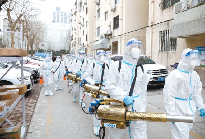 朝陽藍天救援隊22名隊員近日換上防護服,走進六里屯甜水西園等3個社區,為社區做防疫消殺,以減輕社區和物業工作人員的壓力。隊員們穿著防護服、佩戴口罩、安全帽、橡膠手套,手持70多斤重的彌霧機和藥箱,采用地毯式噴灑消毒的方式,對社區封(管)控區的道路、綠化帶等區域進行細致消殺,確保小區內無死角、無盲區。