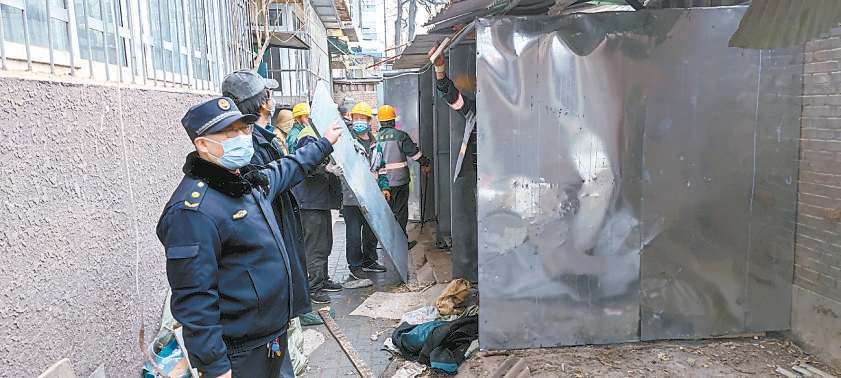 廣安門內(nèi)街道綜合執(zhí)法隊(duì)工作人員正在對私建鐵皮棚進(jìn)行拆除。