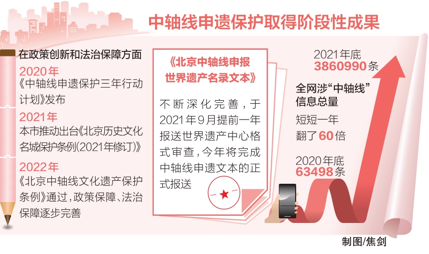 2017年,“積極推進中軸線申遺工作”寫入《北京城市總體規劃(2016年—2035年)》。同年,北京市推進全國文化中心建設領導小組批準成立了中軸線申遺保護專項工作組,全面啟動北京中軸線申遺保護工作……