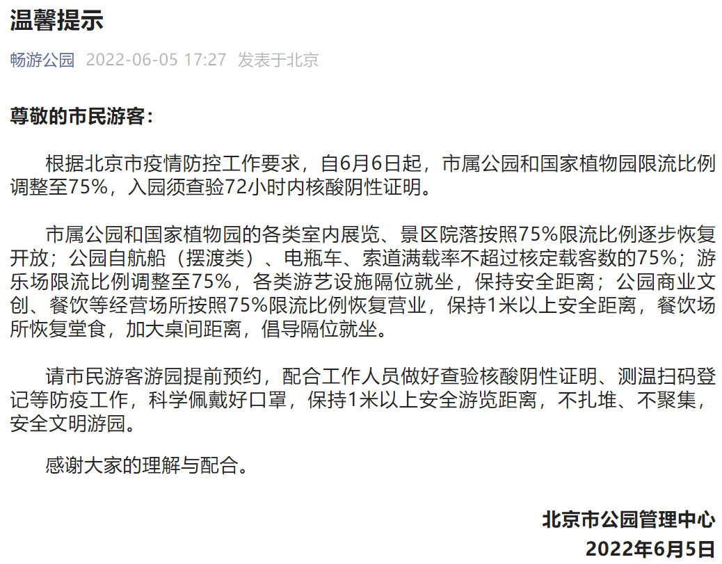 央廣網北京6月6日消息 據北京市公園管理中心消息,根據北京市疫情防控工作要求,自6月6日起,市屬公園和國家植物園限流比例調整至75%,入園須查驗72小時內核酸陰性證明。