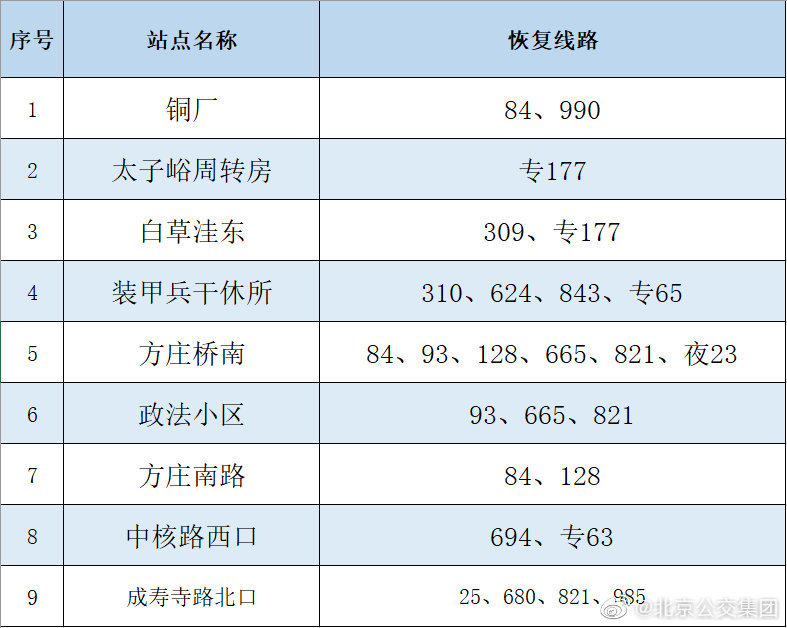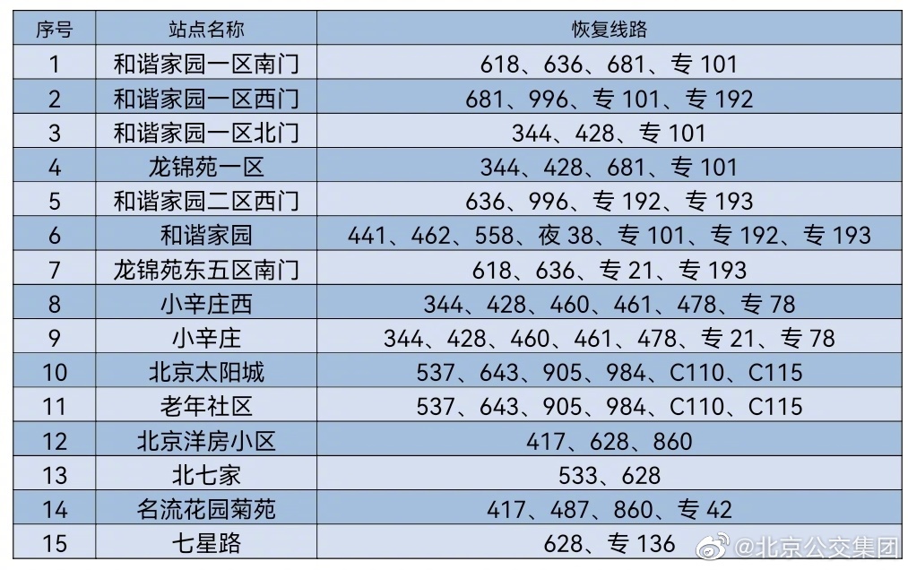 央廣網北京6月16日消息 據北京公交集團官博消息,按照防疫工作要求,自2022年6月16日首班車起,對前期途經昌平區封管控區域周邊采取甩站措施的35條線路以及前期途經豐臺區封管控區域周邊采取甩站措施的18條線路,恢復正常運營,恢復信息詳見下表。