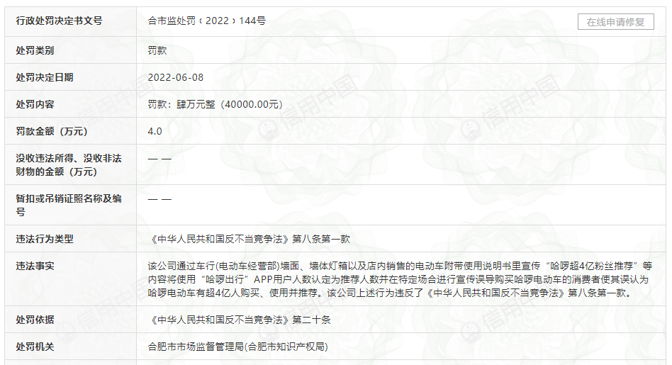 中國市場監(jiān)管行政處罰文書網顯示,2020年5月,哈啰所屬企業(yè)上海鈞正網絡科技有限公司違反了《侵害消費者權益行為處罰辦法》第六條第(八)項:“經營者向消費者提供有關商品或者服務的信息應當真實、全面、準確,不得有下列虛假或者引人誤解的宣傳行為:(八)夸大或隱瞞所提供的商品或者服務的數(shù)量、質量、性能等與消費者有重大利害關系的消息誤導消費者”的規(guī)定,構成了經營者向消費者提供有關商品或者服務的信息不真實、不全面、不準確的行為。綜上,上海市閔行區(qū)市場監(jiān)督管理局對上海鈞正網絡科技有限公司處以罰款4000元。