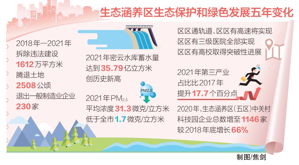 數據顯示,2018年到2021年,生態涵養區累計拆除違法建設1612萬平方米、騰退土地2508公頃、退出一般制造業企業230家。