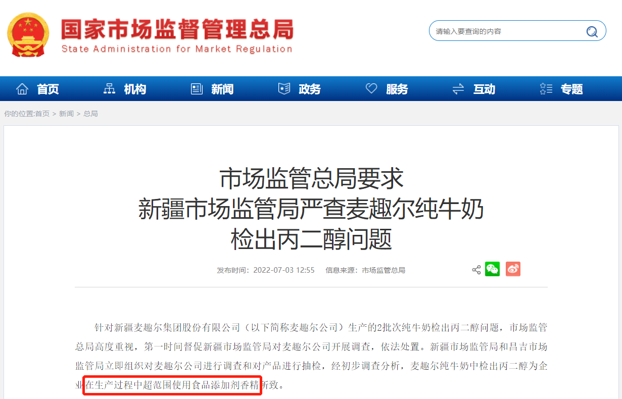 7月3日,國家市場監管總局發布消息,要求“嚴查麥趣爾純牛奶檢出丙二醇問題”,并表示“經初步調查分析,麥趣爾純牛奶中檢出丙二醇為企業在生產過程中超范圍使用食品添加劑香精所致。”