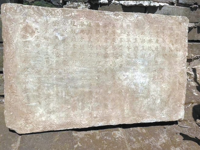 “發現一塊石碑,出土時碑文一面向下,推測這塊石碑原來鑲嵌在北側垛口墻內側,墻體傾斜倒塌后,石碑脫落。”項目考古負責人、北京考古研究院副研究員尚珩介紹。石碑為青石材質,保存完整,邊框刻著纏枝卷草紋。因為脫落時碑文面朝下,因此碑文保存完好,字體為繁體字,字跡娟秀,清晰可辨。