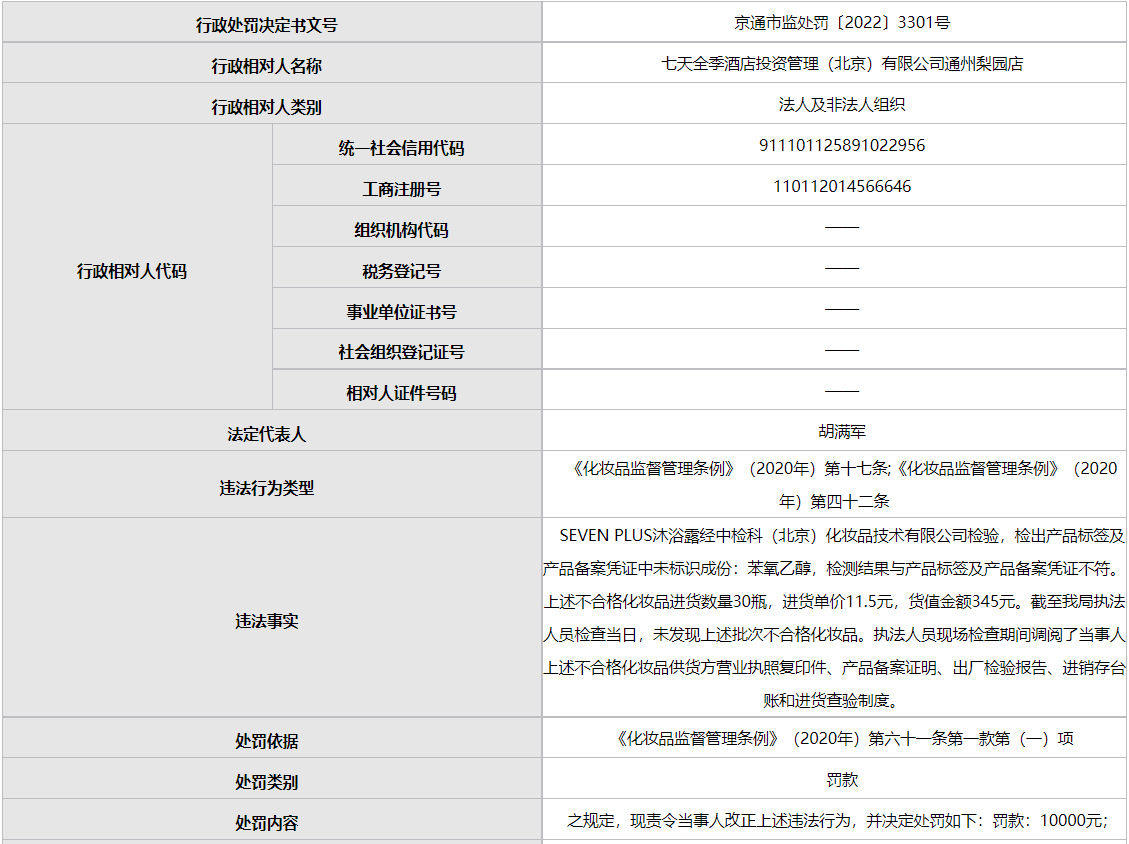 據文號為“京通市監處罰〔2022〕3301號”行政處罰決定書顯示,七天酒店梨園店具體違法事實為:SEVEN PLUS沐浴露經中檢科(北京)化妝品技術有限公司檢驗,檢出產品標簽及產品備案憑證中未標識成份:苯氧乙醇,檢測結果與產品標簽及產品備案憑證不符。上述不合格化妝品進貨數量30瓶,進貨單價11.5元,貨值金額345元。