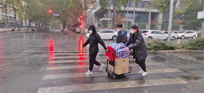 學校進入臨時管控狀態,但很多學生人在住宿區、學習物品在北校園的學習區,怎么辦?該校通過接訴即辦平臺收到學生的反映后,立即作出決策,成立物品傳遞轉運隊伍,幫助學生解決人與學習物品分離的問題,學院書記、院長和師生志愿者立即行動起來組建搬運隊伍,有的在校內幫忙打包學生物資,有的在校外接應、及時將學生所需物資送到學生手里。