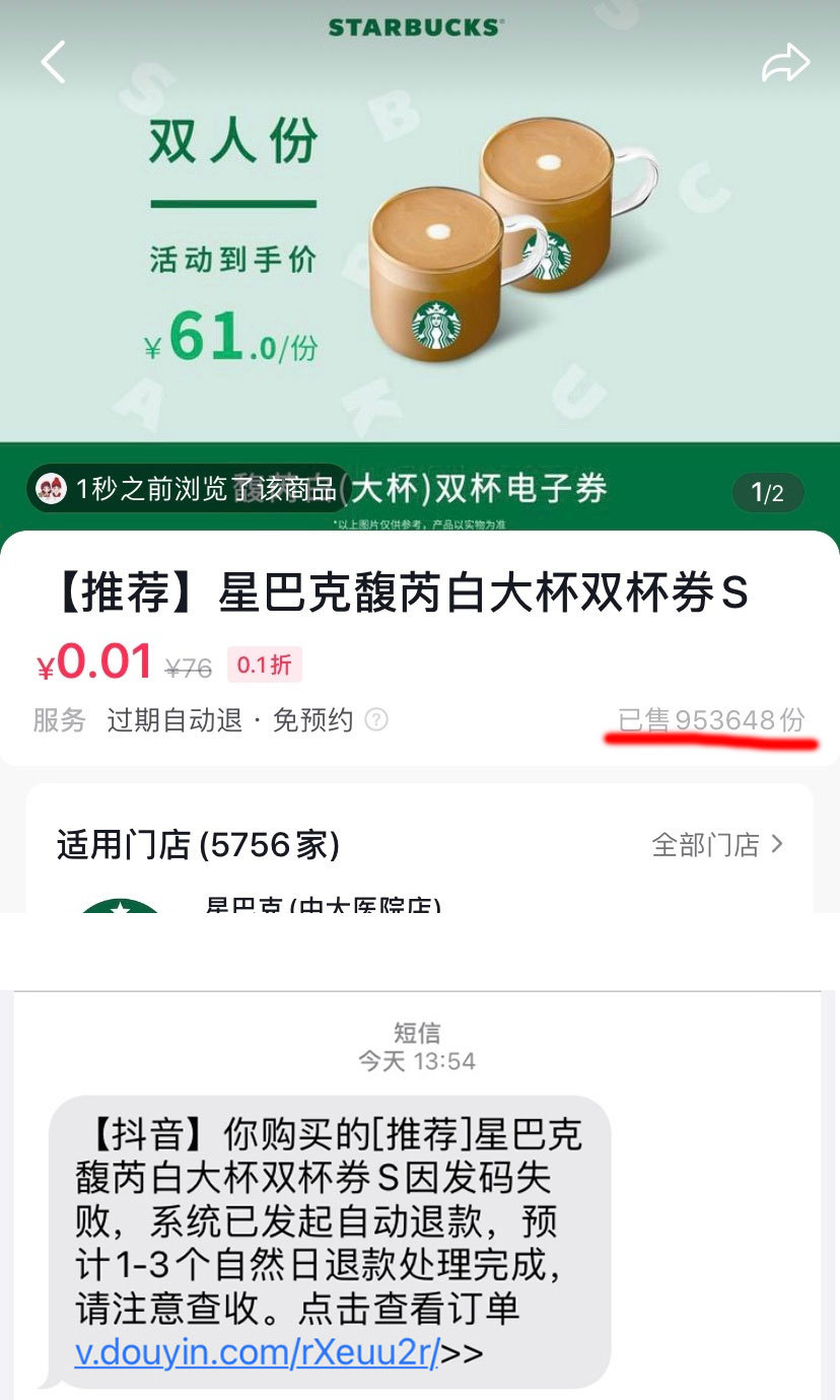 央廣網記者注意到,23日有多名網友在社交平臺微博反饋,星巴克近日在某平臺推出0.01元購2杯馥芮白咖啡券團購活動,賣出95萬多單。但是不少消費者表示搶券后,發現無法兌換,被星巴克自動退款了。