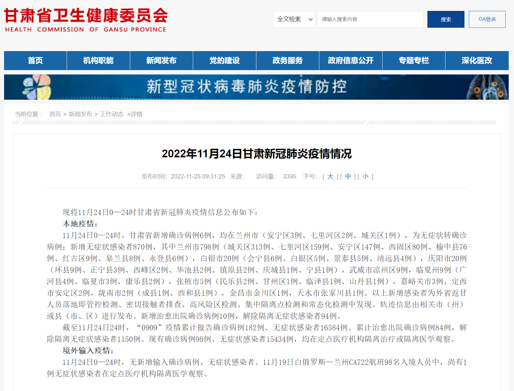 11月24日甘肅新增確診病例6例,無癥狀感染者870例
