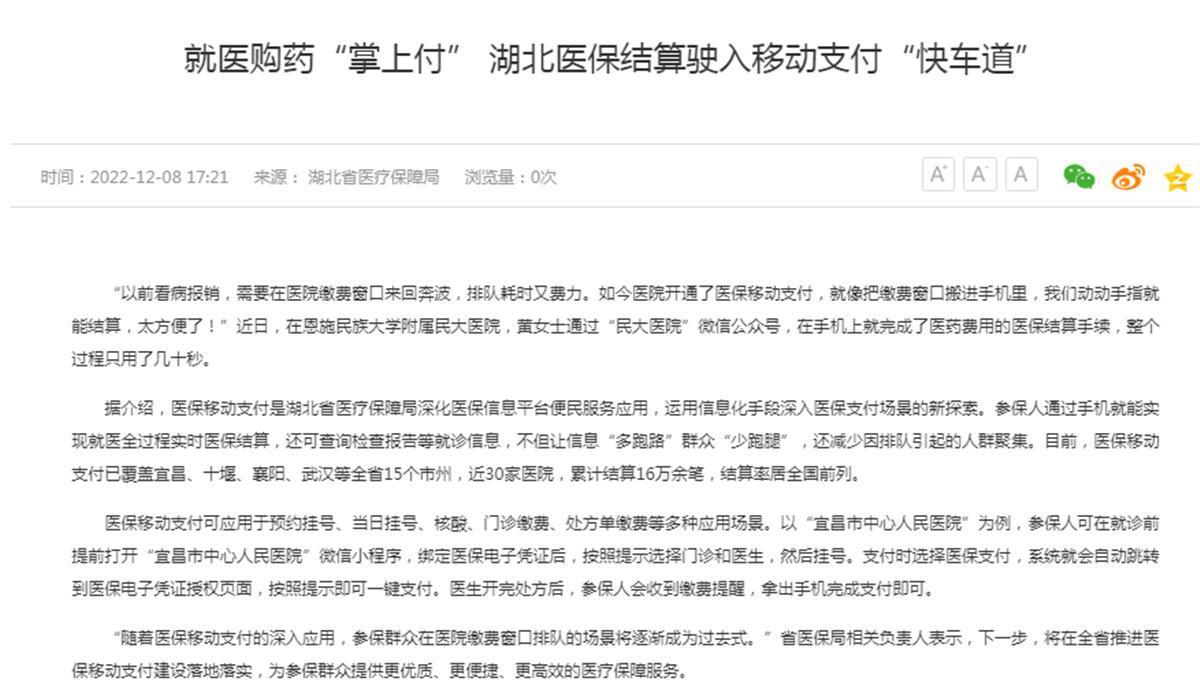 “以前看病報銷,需要在醫院繳費窗口來回奔波,排隊耗時又費力。如今醫院開通了醫保移動支付,就像把繳費窗口搬進手機里,我們動動手指就能結算,太方便了!”近日,在湖北民族大學附屬民大醫院,黃女士通過“民大醫院”微信公眾號,在手機上就完成了醫藥費用的醫保結算手續,整個過程只用了幾十秒。