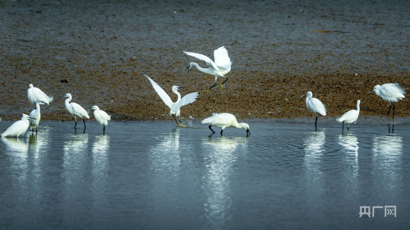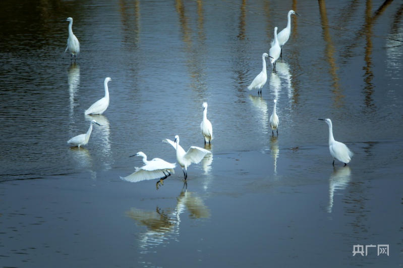 白鷺追逐在湖畔淺灘,捕食著可口的小魚小蝦(央廣網發 陳扶南 攝)