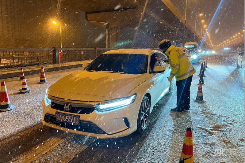 新疆烏魯木齊市水磨溝區交警大隊民警正在引導車輛有序通行(央廣網發 烏魯木齊市水磨溝區交警大隊 供圖)