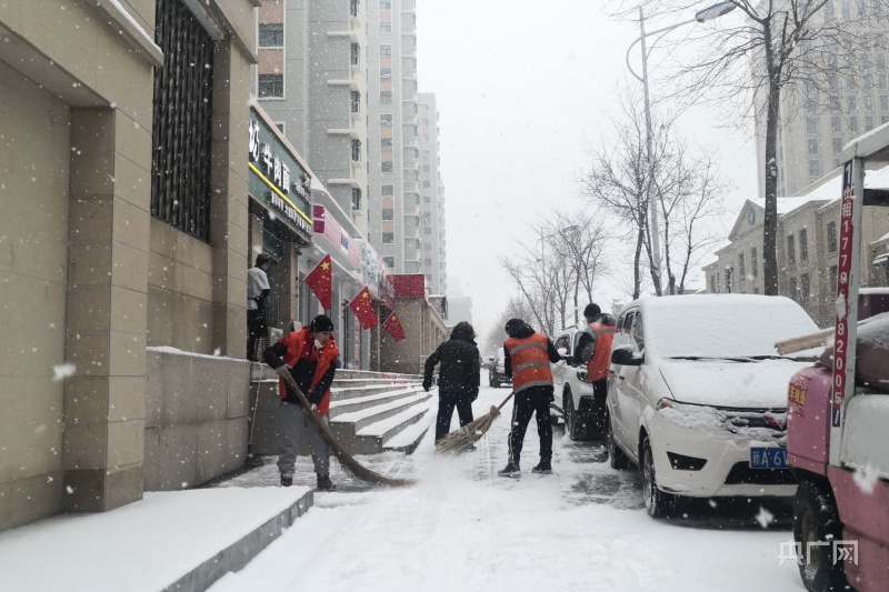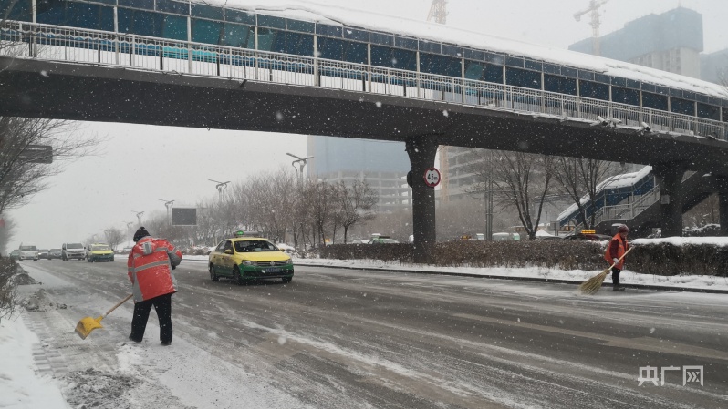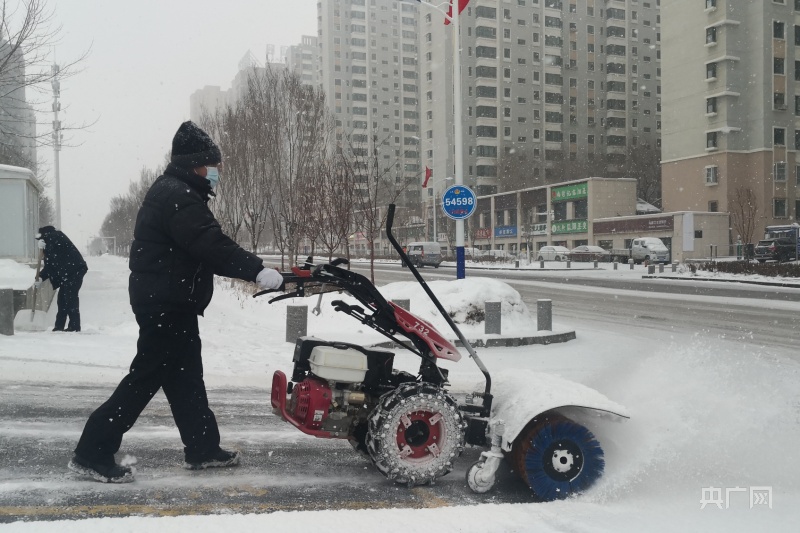 在新疆烏魯木齊市,工作人員正在清理道路積雪(央廣網記者羅成 攝)