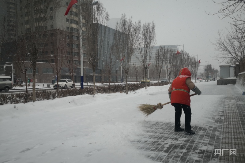 在新疆烏魯木齊市,環衛工人正在清掃路面積雪(央廣網記者羅成 攝)