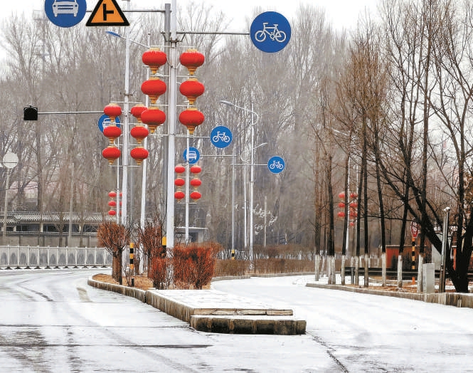 昨天午后,延慶區雪花紛紛揚揚,大街鋪上了薄薄一層白雪。本報記者 吳鏑攝